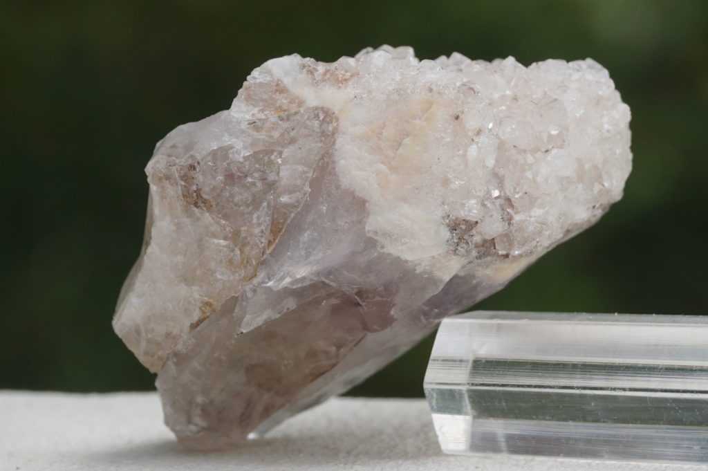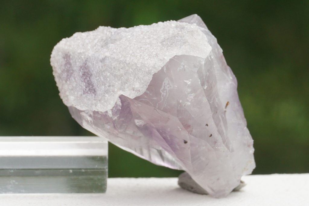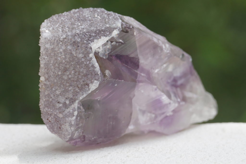 アメジストポイント原石の上部に、まるでケープをまとうようにドゥルージー状の水晶が結晶していて、キラキラと煌めきます。